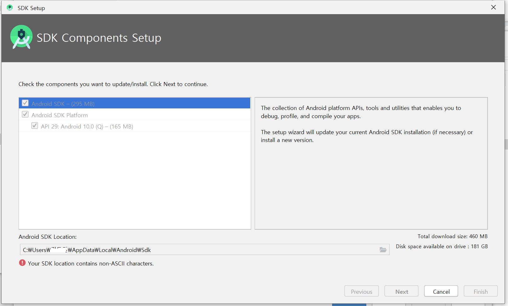 쉽게 말하면 SDK 경로에 아스키 코드가 아닌 문자가 있다는 것이다.
